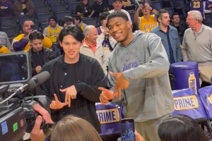 賽前,最近加盟MLB道奇隊(duì)的日本天才棒球手佐佐木朗希與老鄉(xiāng)八村塁見(jiàn)面,后者教其比出LA的手勢(shì)。