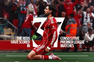 利物浦官推也曬出索博滑跪慶祝照,并曬出最近37場英超對手的隊徽,同時指出:“紅軍連續(xù)37場英超均能破門,這也是俱樂部的新紀(jì)錄。”