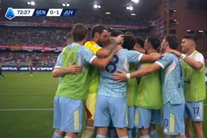 體育資訊09月01日訊 尤文vs熱那亞第73分鐘,弗拉霍維奇頭球破門,全隊簇?fù)碇麘c祝!此時比分變?yōu)橛任?-0!