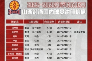 體育資訊9月1日訊 今天,山西男籃官方宣布了新賽季的國(guó)內(nèi)球員注冊(cè)信息,原文如下: