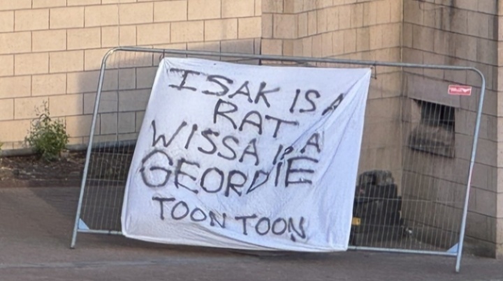 標(biāo)語上寫著,Isak is a rat, Wissa is a Geordie, Toon Toon.(翻譯參考:伊薩克是叛徒,維薩是自家人,紐卡!紐卡?。?/p>