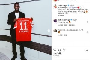 杰克遜曬出手拿拜仁11號(hào)球衣的照片,并寫道:“很自豪能加盟拜仁,對(duì)這個(gè)新挑戰(zhàn)感到興奮,迫不及待想要在安聯(lián)球場(chǎng)踢球了!Mia San Mia!!”