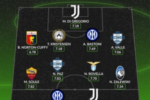 后衛(wèi):諾頓-庫菲(熱那亞,6.78分)、T-克里斯滕森(烏迪內斯,7.18分)、巴斯托尼(國米,7.69分)、亞歷克斯-瓦萊(科莫,7.06分)