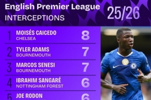 體育資訊9月3日訊 數(shù)據(jù)機構squakwa統(tǒng)計了新賽季英超球員攔截情況,凱塞多位列榜首。