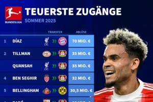 體育資訊9月4日訊 德甲夏窗已經(jīng)截止,《轉(zhuǎn)會市場》也統(tǒng)計(jì)了德甲今夏的最貴引援榜,路易斯-迪亞斯斷崖領(lǐng)跑。