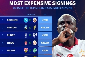 體育資訊9月4日訊 德國轉(zhuǎn)會(huì)市場列出了今夏五大聯(lián)賽之外球隊(duì)的最貴引援排名,奧斯梅恩居首,雷特吉次席。