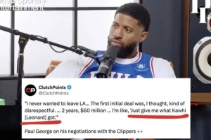 此前,萊昂納德從快船得到了一份3年1.5億美元的合同。據(jù)當(dāng)時報道喬治想要同樣的合同,最終喬治選擇4年2.12億簽約76人。