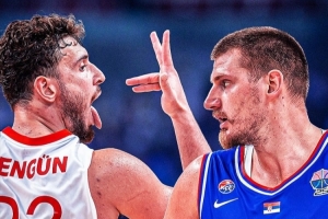 塞爾維亞今天輸給土耳其之后屈居小組第2,8/1決賽對陣芬蘭,他們和德國男籃同一個半?yún)^(qū),如果都一路晉級,那么會在半決賽相遇。