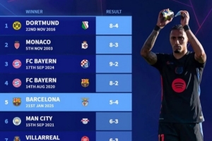 體育資訊1月22日訊 巴薩在本輪歐冠小組賽5-4絕殺本菲卡,兩隊上演進(jìn)球大戰(zhàn)?!掇D(zhuǎn)會市場》也列出了歐冠本世紀(jì)最大比分榜。
