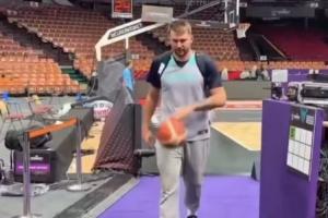 東契奇背著包準(zhǔn)備離開訓(xùn)練場(chǎng),他的斯洛文尼亞國(guó)家隊(duì)隊(duì)友阿倫-歐米奇表示,若東契奇能在通道里投進(jìn)三分,他就做50個(gè)俯臥撐,東契奇投進(jìn)了。