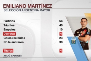據(jù)ESPN統(tǒng)計(jì),大馬丁為阿根廷國家隊(duì)出戰(zhàn)54場比賽,僅輸?shù)羝渲?場。