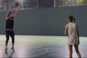 付豪配文寫道:“美好的一切?!币曨l中,付豪在練習(xí)投籃,其妻子幫他撿球。