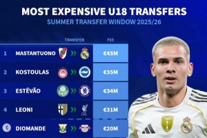 體育資訊9月5日訊 《轉(zhuǎn)會市場》統(tǒng)計(jì)了今夏的U18球員最貴轉(zhuǎn)會費(fèi)榜單,皇馬4500萬簽下馬斯坦托諾居首。