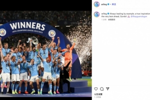 哈蘭德曬出了京多安作為隊長捧起隊史首座歐冠獎杯的照片,并配文:“始終以身作則,真正鼓舞大家。祝你一切順利,Gundo(對京多安的昵稱)!”