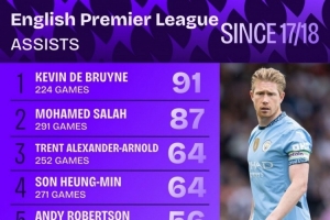 體育資訊9月7日訊 Squawka統(tǒng)計了2017-2018賽季以來球員在英超助攻的次數(shù),并列出榜單,德布勞內(nèi)91助居首,薩拉赫87助次席。