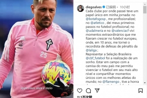 體育資訊1月22日訊 39歲的前巴西國門迭戈-阿爾維斯,通過社媒宣布退役。