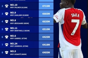 體育資訊9月9日訊 德國轉(zhuǎn)會(huì)市場對英超球星球衣號碼的市場價(jià)值進(jìn)行排行,其中身披7號球衣的薩卡總市場價(jià)值達(dá)到7.71億歐元居首。