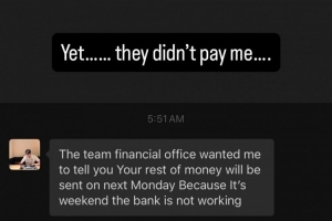 帕斯卡爾曬出兩張圖片和一段視頻,第一張圖片中的文字為“球隊(duì)希望我告訴你,你的剩余薪水會(huì)在下周一支付,因?yàn)楝F(xiàn)在是周末,銀行不上班。”“然而,他們沒(méi)有付我錢?!迸了箍栐趫D片中寫道。