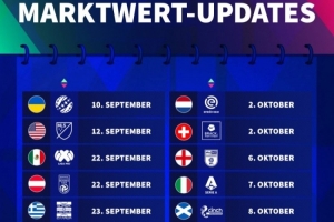 體育資訊9月9日訊 德轉(zhuǎn)市場今日更新,公布了各聯(lián)賽球員德轉(zhuǎn)身價更新的時間,其中英超聯(lián)賽將在當(dāng)?shù)貢r間10月17日更新,西甲10月2日更新,意甲10月7日更新,德甲10月14日更新,法甲10月10日更新。
