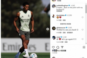貝林厄姆社媒曬出訓(xùn)練照片,配文:“(缺席)8周,終于回到球場(chǎng)與我的兄弟們?cè)谝黄?。?/p>