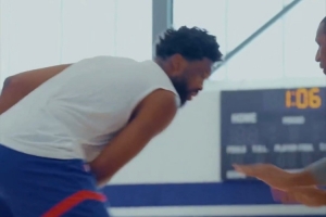 體育資訊9月10日訊 今日,76人官方推特曬出一組恩比德和喬治的訓練片段。