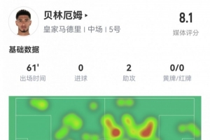 體育資訊1月23日訊 正在進(jìn)行的歐冠,皇馬主場4-0領(lǐng)先薩爾茨堡紅牛。此役貝林厄姆首發(fā)63分鐘被換下,球員全場重點(diǎn)數(shù)據(jù)如下↓