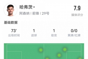 體育資訊1月23日訊 歐冠聯(lián)賽階段第7輪,阿森納主場對陣薩格勒布迪納摩。哈弗茨首發(fā)出戰(zhàn),傳射建功,還送出1次關鍵傳球,評分7.9。