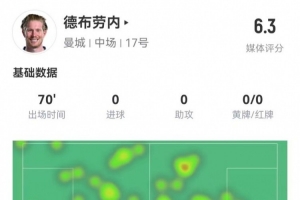 體育資訊1月23日訊 曼城在本輪歐冠目前2-2戰(zhàn)平巴黎,德布勞內(nèi)本場數(shù)據(jù)如下: