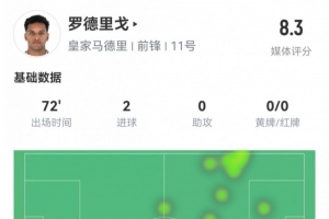 體育資訊1月23日訊 正在進行的歐冠,皇馬主場5-0領(lǐng)先薩爾茨堡紅牛。此役羅德里戈首發(fā)72分鐘被換下,球員全場重點數(shù)據(jù)如下↓