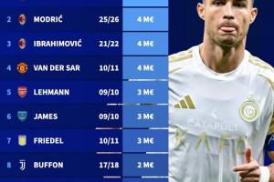 體育資訊09月12日訊 轉(zhuǎn)會市場網(wǎng)盤點了足壇歷史上40歲以上球員的身價排名,其中本賽季的C羅以1200萬歐元高居榜首。