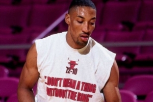 圖片中,皮蓬穿著一件紀(jì)念公牛95-96賽季常規(guī)賽取得72勝10負(fù)的運(yùn)動衫,衣服上印著:沒有戒指的話,一切都沒有意義。