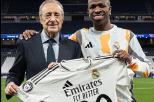 維尼修斯也就此達(dá)成了效力皇馬100粒進(jìn)球里程碑,賽后主席弗洛倫蒂諾也贈(zèng)與他100球紀(jì)念球衣,兩人也合影留念。