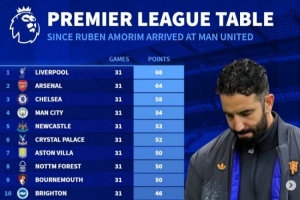德轉列自阿莫林執(zhí)教曼聯(lián)以來各隊在英超取得的積分情況,阿莫林帶隊31輪僅取得31分,僅高于上賽季三支英超降級隊,距第1名31輪取得68分的利物浦相差37分。