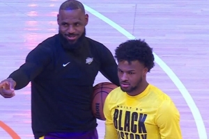 只見詹姆斯從場邊走向正在練習(xí)投籃的布朗尼,并指向場邊:“布朗尼,你媽說她要叫你過去!”布朗尼則立即停止訓(xùn)練,掃視場下媽媽的位置。