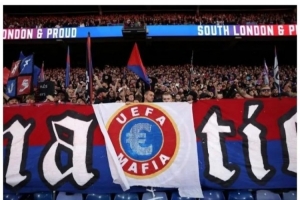 水晶宮球迷展示的橫幅將歐足聯(lián)標(biāo)志中的歐洲地圖替換為歐元符號(hào),并標(biāo)有“UEFA MAFIA”(歐足聯(lián)黑手黨)字樣。