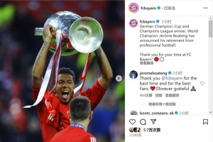 博阿滕留言回復(fù):“感謝拜仁給了我最好的時光,感謝最好的球迷,永遠(yuǎn)感恩。”