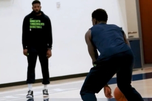 體育資訊9月20日訊 今天,森林狼在官推上曬出一段愛(ài)德華茲和蘭德?tīng)栆黄鹩?xùn)練的視頻。