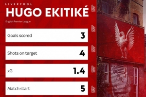據(jù)媒體統(tǒng)計,埃基蒂克英超開局5場比賽皆首發(fā)出戰(zhàn),射正4次,預期進球1.4粒,打進3球。