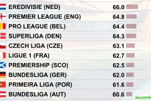 各聯(lián)賽球員平均高強(qiáng)度跑動(dòng)數(shù)據(jù)對(duì)比:荷甲第一,英超第二比甲第三