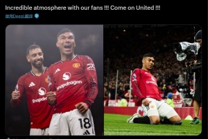 卡塞米羅曬出自己的賽場照,并配文:球迷們營造的氛圍簡直太棒了?。?!加油曼聯(lián)?。?!