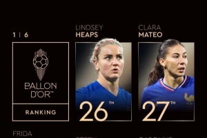 體育資訊9月22日訊 金球獎頒獎典禮,女足金球獎排名第26-30名公布。