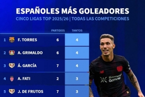 體育資訊9月23日訊 德國(guó)轉(zhuǎn)會(huì)市場(chǎng)統(tǒng)計(jì)了五大聯(lián)賽西班牙球員本賽季的進(jìn)球數(shù)量,并列出榜單,費(fèi)蘭-托雷斯、格里馬爾多、A-加西亞4球居首。