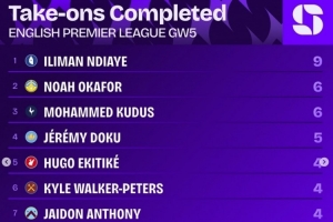 體育資訊9月24日訊 英超第5輪戰(zhàn)罷,squawkafootball列各項(xiàng)數(shù)據(jù)排行,埃弗頓邊鋒恩迪亞耶是完成過(guò)人最多的球員,共9次。