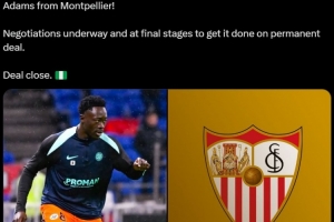 報(bào)道稱塞維利亞與蒙彼利埃的談判還在繼續(xù),不過(guò)已經(jīng)進(jìn)入最后階段,亞當(dāng)斯將永久轉(zhuǎn)會(huì)塞維利亞。交易接近完成。