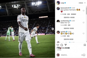 維尼修斯社媒曬出比賽照片,莫德里奇留言評論:“多么精彩的進球,兄弟?!?/p>
