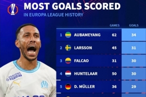體育資訊9月25日訊 德國(guó)轉(zhuǎn)會(huì)市場(chǎng)盤點(diǎn)了歐聯(lián)杯球員歷史進(jìn)球排名,奧巴梅揚(yáng)34球居首。