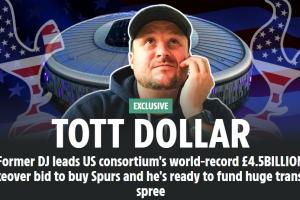 體育資訊09月26日訊 太陽(yáng)報(bào)獨(dú)家報(bào)道,一家美國(guó)財(cái)團(tuán)計(jì)劃以創(chuàng)世界紀(jì)錄的45億英鎊總報(bào)價(jià)買托特納姆熱刺。