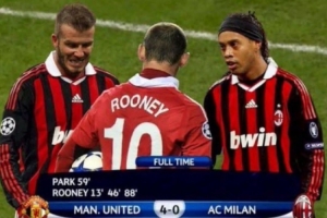 尷尬的是,這張圖片是一張P圖。2009-10賽季歐冠1/8決賽次回合,曼聯(lián)確實4-0擊敗了米蘭,但是魯尼在那場比賽打進2球,另外兩球是樸智星和弗萊徹打進,而且米蘭那場比賽身穿的是黑色球衣,也不是圖片里的紅黑間條衫。