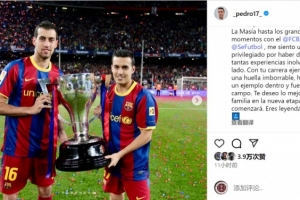 佩德羅社媒曬出與布斯克茨的捧杯合照,寫道:“一位足球巨星宣布退役,感謝布斯克茨為我們奉獻(xiàn)的精彩足球!