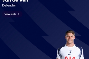 此役范德文為熱刺踢滿全場,這位中衛(wèi)當(dāng)選本場比賽最佳球員。